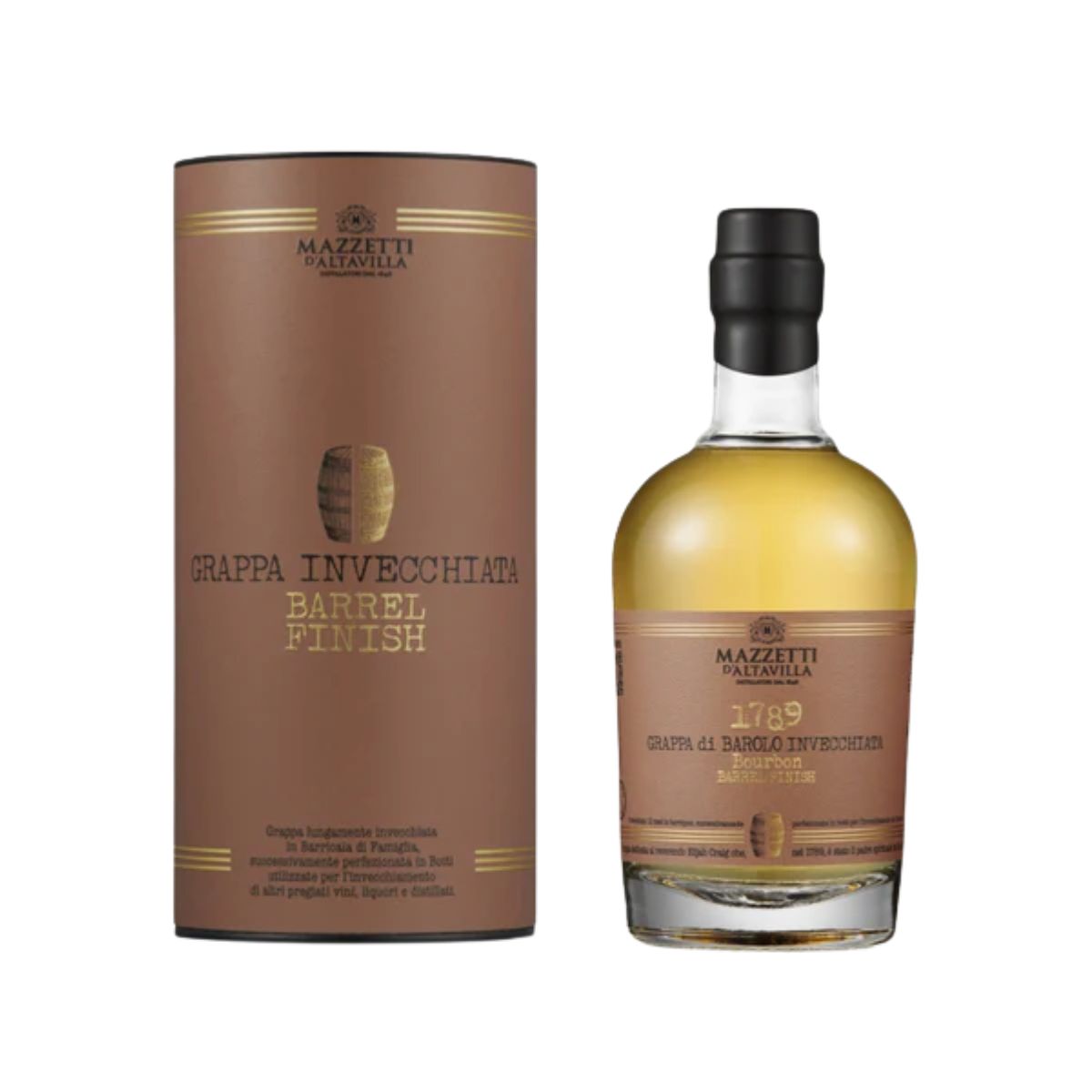 Grappa di Barolo 1789 Mazzetti d’Altavilla: è una grappa secca realizzata da vinacce di Nebbiolo di Barolo e invecchiata a lungo in botti ex-Bourbon. Il colore è ambrato intenso e brillante. Al naso presenta note intense e complesse di tostatura, vaniglia, frutta secca, spezie, cacao e caffè. Il gusto è molto morbido, complesso, raffinato, armonico e di grande intensità. Si presenta di colore giallo paglierino tenue. Al naso è di media intensità, avvolgente, ampia e complessa, con piacevoli note speziate di tabacco e vaniglia, seguono sfumature di tostatura e frutta secca con leggeri sbuffi vinosi nel finale. In bocca è rotonda, equilibrata, secca, raffinata, coerente con gli aromi al naso percepiti.