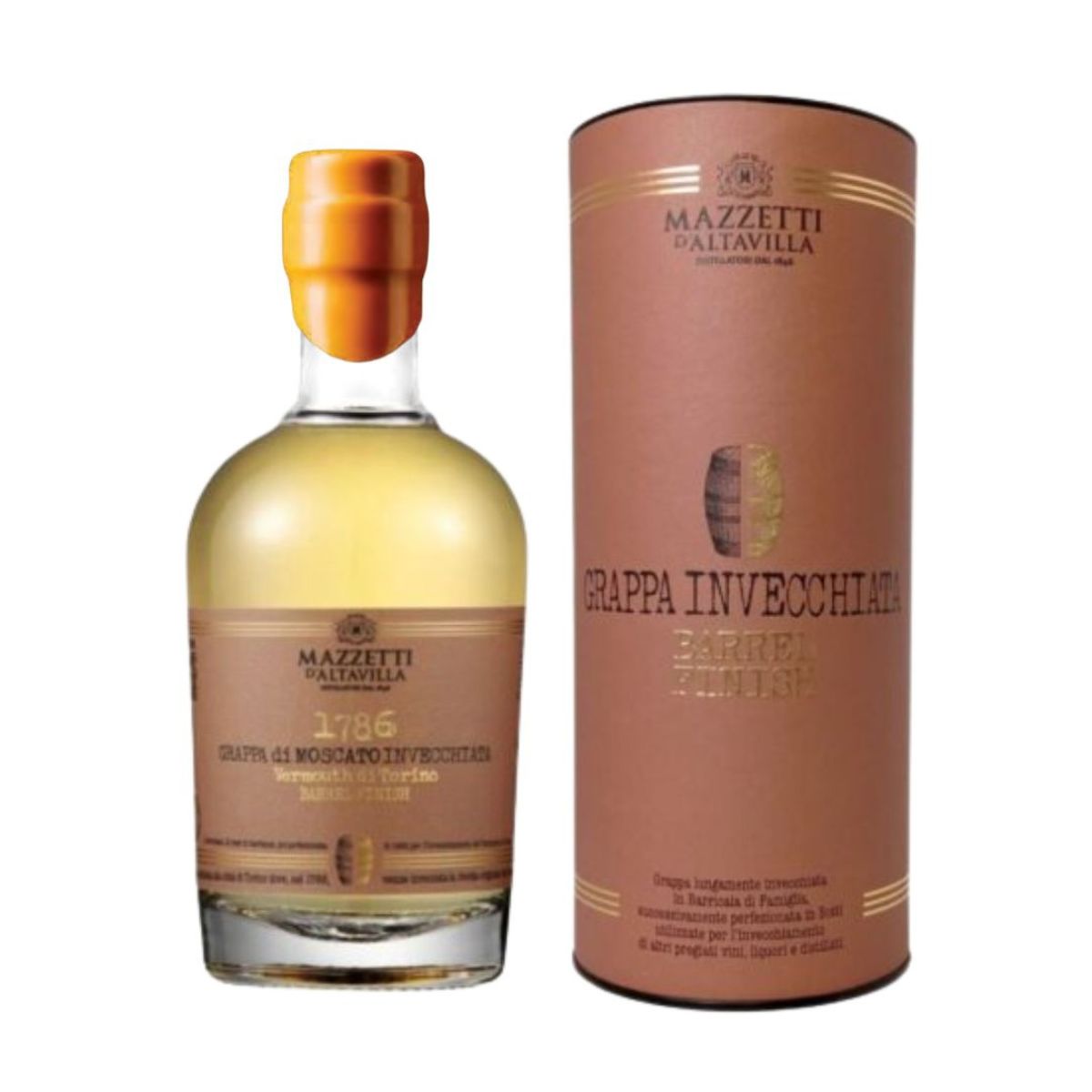 Grappa di Moscato 1786 Mazzetti d’Altavilla: è una grappa aromatica piemontese che matura in botti ex-Vermouth di Torino. Ha un profilo aromatico molto gentile e ricco, con note di erbe aromatiche, uva appassita, cenni erbacei e ricordi dolci e tostati. Rivela un corpo avvolgente e suadente, rotondo e persistente su piacevoli note aromatiche. TEMPERATURA DI SERVIZIO:16-18° C.