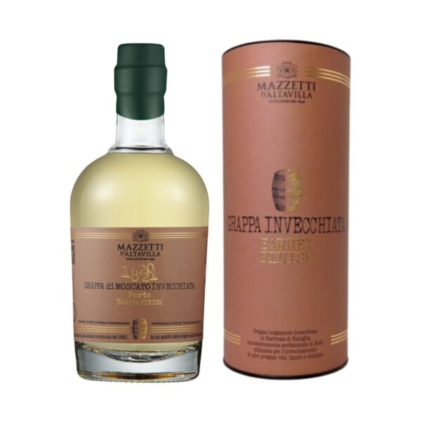 Grappa di Moscato 1820-21 Mazzetti d’Altavilla: è una grappa ottenuta da un eco-distillazione di sole vinacce di Moscato, provenienti dai migliori produttori vinicoli del Piemonte. Al termine del processo di distillazione, la grappa invecchia in legno per almeno 18 mesi e svolge un ulteriore invecchiamento finale in botti che in precedenza contenevano Vino Porto. La 1820-21 prende il nome dalla migliore annata mai prodotta in Portogallo, di bontà tale che è da quella data che la richiesta del vino porto si è avuta anche fuori regione. Si presenta di colore giallo paglierino tenue. Al naso è di media intensità, avvolgente, ampia, con piacevoli note fruttate di ciliegie e fragole, seguono note di cannella, cioccolato e vaniglia. In bocca è rotonda, equilibrata, raffinata, con piacevoli note speziate.