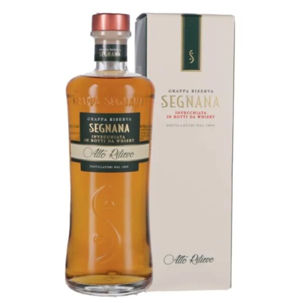 Grappa Riserva Alto Rilievo ‘Invecchiata In Botti di Whisky’ Segnana: distillato che presenta una particolarità. Viene infatti fatta maturare in botti ex-Whisky, è una grappa che ha origine da vinacce di diverse uve, che conferiscono alla stessa, eleganza e struttura. Al termine del processo di lavorazione, la grappa ottenuta viene fatta invecchiare in botti precedentemente utilizzate per la produzione di whisky e provenienti dall’ isola di Islay, in Scozia. Si presenta di colore mediamente ambrato, derivante dalla lunga permanenza in legno, emana note affumicate e torbate, colpisce al naso per gli intensi aromi di frutta secca e al palato per la suadente morbidezza. Temperatura di servizio: 16-18°C.