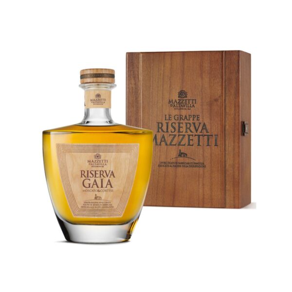Grappa Riserva Gaia Mazzetti d’Altavilla: è frutto del paziente invecchiamento di oltre 18 mesi delle singole Grappe monovitigno in piccole botti di rovere di Allier e di Castagno. Il Moscato conferisce note aromatiche d’eccezione, unite a bouquet che ricordano i fiori estivi. Colore ambrato carico e luminoso. Aroma elegante e sottile, caratterizzato da note dolci e fruttate, con fini sentori erbacei e note agrumate di mandarino e arancia. TEMPERATURA DI SERVIZIO: 18-20°C.