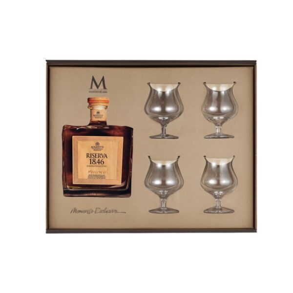 Confezione Grappa Riserva 18.46 Mazzetti D’Altavilla + 4 bicchieri: dopo 18 mesi di invecchiamento nella batteria numero 46nasce Riserva 18.46. Si parte dalla distillazione con processo discontinuo e successivo invecchiamento per oltre dodici mesi in barriques di Rovere d’Allier. Le vinacce utilizzate sono di uve Barbera e Dolcetto. All’estrazione fa seguito l’assemblaggio e l’ulteriore affinamento per almeno sei mesi in botti di Castagno. Grappa dal colore ambrato e dal gusto aromatico. TEMPERATURA DI SERVIZIO: 16-18°C. La grappa è accompagnata da 4 bicchieri per la sua degustazione.