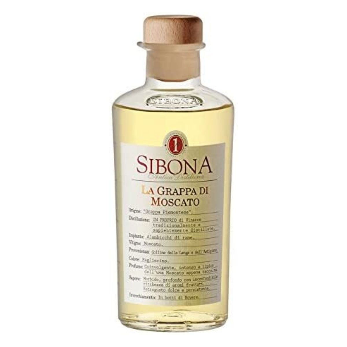 La grappa di Moscato Sibona: grappa ottenuta da sole vinacce di Moscato e invecchiata per 12 mesi in botti di rovere. Il colore è giallo dorato luminoso. Il profumo è floreale, con note di frutta gialla. Il gusto è morbido e armonico, con ritorni aromatici di fiori e miele.