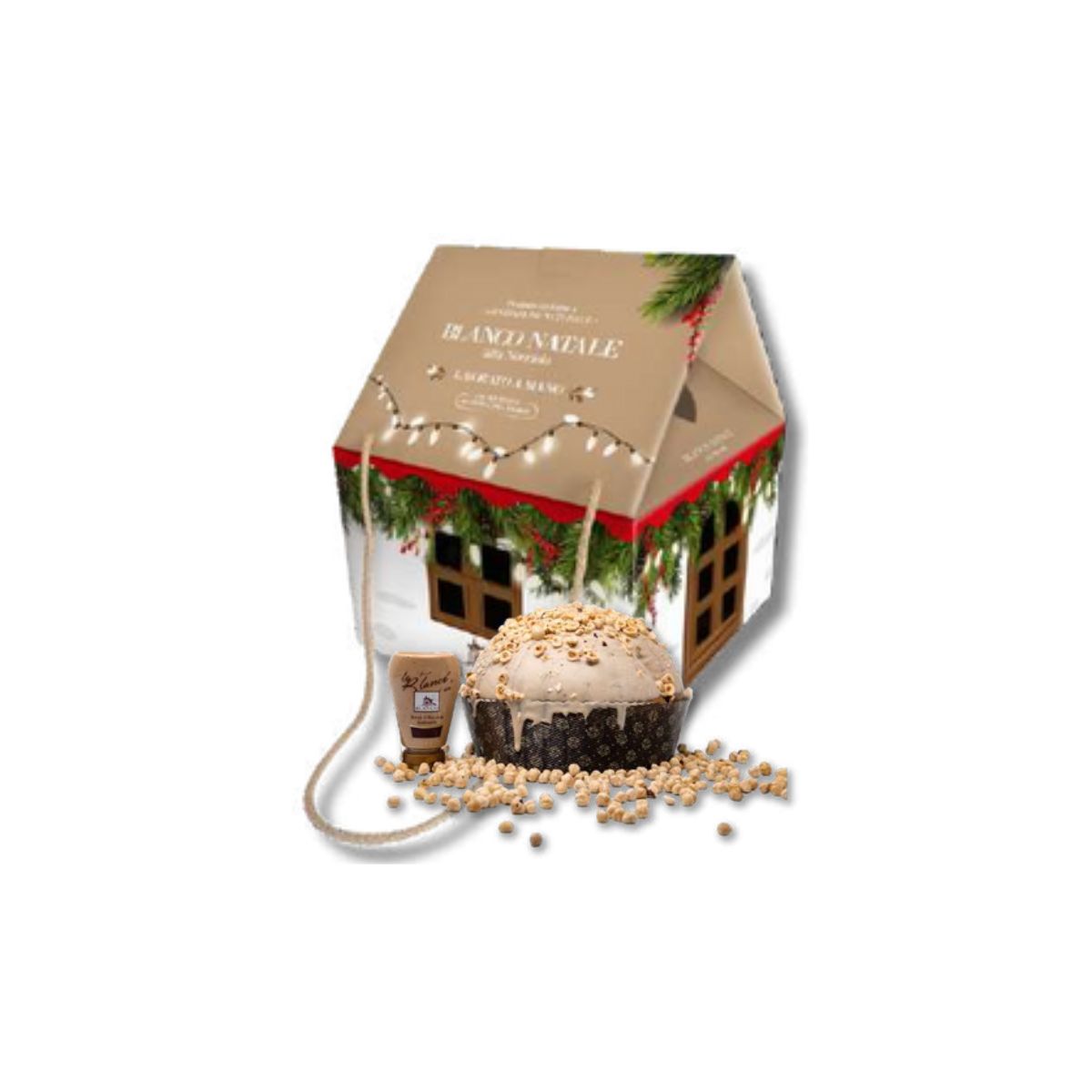 Casetta Panettone alla Nocciola + squeezer di Crema alla nocciola Blanco Dolci: si parte dalle migliori materie prime, dalle uova al burro di qualità premium. Segue un processo di lievitazione lenta, ben 72 ore, arricchito dal costante lavoro del lievito madre. Nasce così un prodotto dalla consistenza soffice e delicata, un vero piacere per il palato. A completare il tutto, la crema alla nocciola; contenuta in un pratico squeezer da 190 g. Incartato in una bellissima scatola a forma di Casetta.
