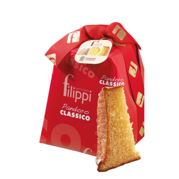 Pandoro Classico Filippi: Il “Pan de oro”, Pandoro, chiamato appunto in questo modo per la sua naturale colorazione giallo-dorata, ha un impasto morbidissimo e profumato ottenuto con l’impiego di burro fresco centrifugato a freddo e bacche di vaniglia Bourbon. Perché sia davvero buono farina, uova, latte e burro freschi devono essere di alta qualità e maneggiati con cura nel lungo processo di preparazione, a partire dalla Pasta Madre, che richiede una dedizione costante: attraverso rinfreschi giornalieri e impastatura energica e riposo in ambiente salubre e protetto. Ottimo da gustare sia semplice che accompagnato da creme, soprattutto al cioccolato.