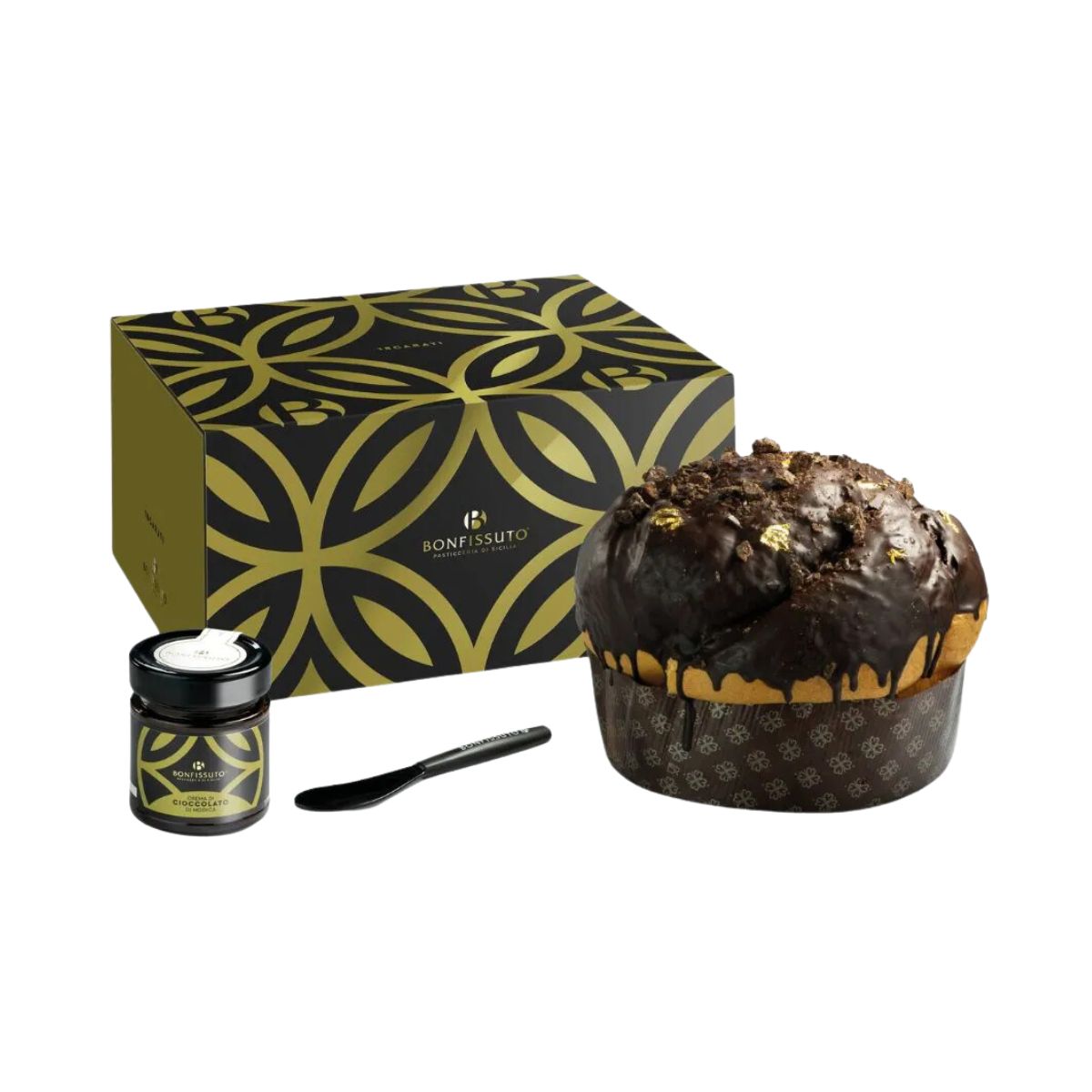 Panettone al Cioccolato 18 Carati Bonfissuto : confezione formata da panettone 18 Carati a lievitazione naturale senza uvetta e canditi; copertura di cioccolato fondente, pezzi di Cioccolato di Modica, foglia d’oro alimentare 18 carati e un vasetto di crema di Cioccolato di Modica tutta da spalmare, spalmino in dotazione.