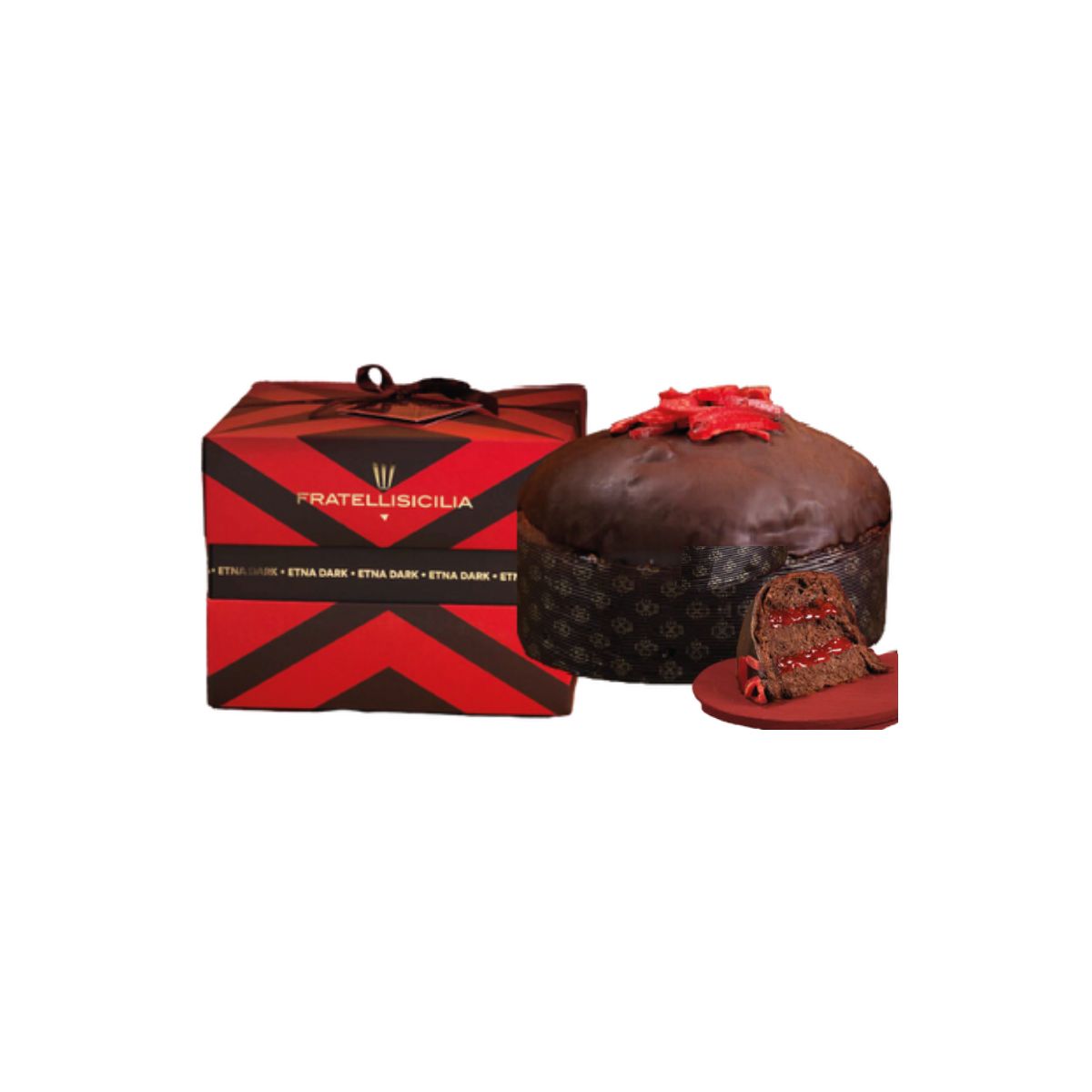 Panettone al Cioccolato Fondente con crema di Arancia rossa igp Fratelli Sicilia: lievito madre, uova da galline allevate a terra, burro, farina e tanta passione. Trentasei ore di lievitazione insieme ad una sapiente lavorazione che hanno permesso di creare un prodotto soffice, profumato e dal sapore intenso. “Un omaggio al nostro vulcano” dicono i Fratelli; per questo il panettone è stato nominato: “Etna Dark”. Soffice impasto con cioccolato extra dark, guarnito da semicanditi di arancia amara e avvolto da cioccolato extra fondente. Farcito da una delicata crema di arancia rossa dal colore intenso come il magma. Un esplosione di sapore.