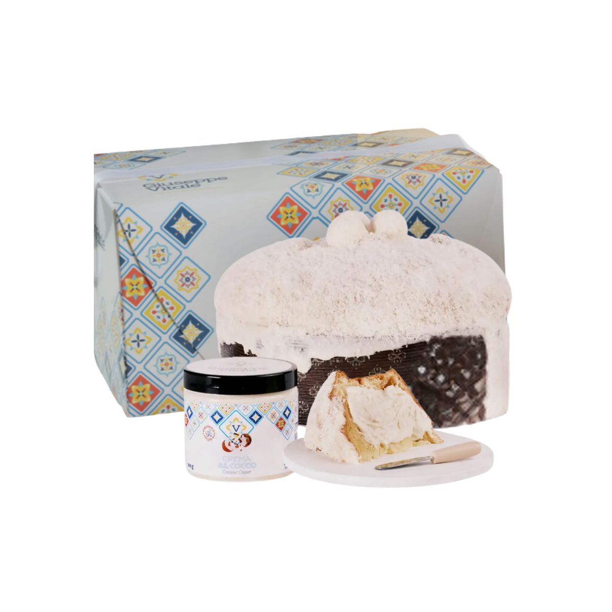 Panettone al Cocco Giuseppe Vitale: panettone artigianale con copertura al cioccolato bianco e cocco, accompagnato da un vasetto da 200g di crema al cocco.