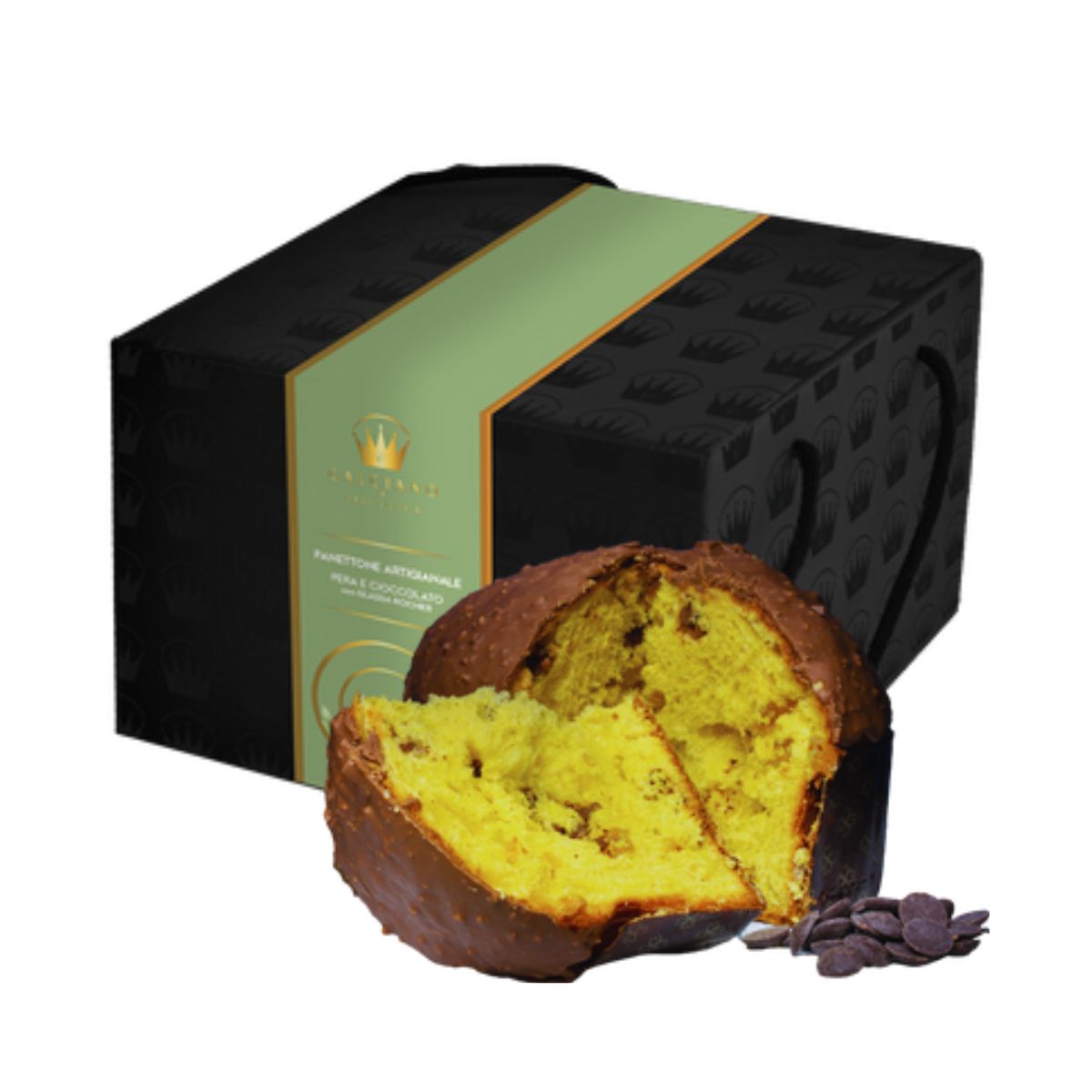Panettone Cioccolato e Pere Calciano: Il punto di forza dei panettoni Calciano è, essenzialmente, il lievito madre. Rinfrescato quattro volte al giorno ogni quattro ore, garantisce morbidezza, fragranza, profumo e conservabilità del prodotto finale, senza l’utilizzo di alcun tipo di conservante. Fondamentale per la creazione di un prodotto d’eccellenza è chiaramente la scelta di materie prime d’alta qualità e il successivo susseguirsi di numerose fasi di lavorazione.Un classico, una deliziosa ricetta di pasticceria. Un abbinamento che unisce alla dolcezza della pera l’intensità del cioccolato fondente.