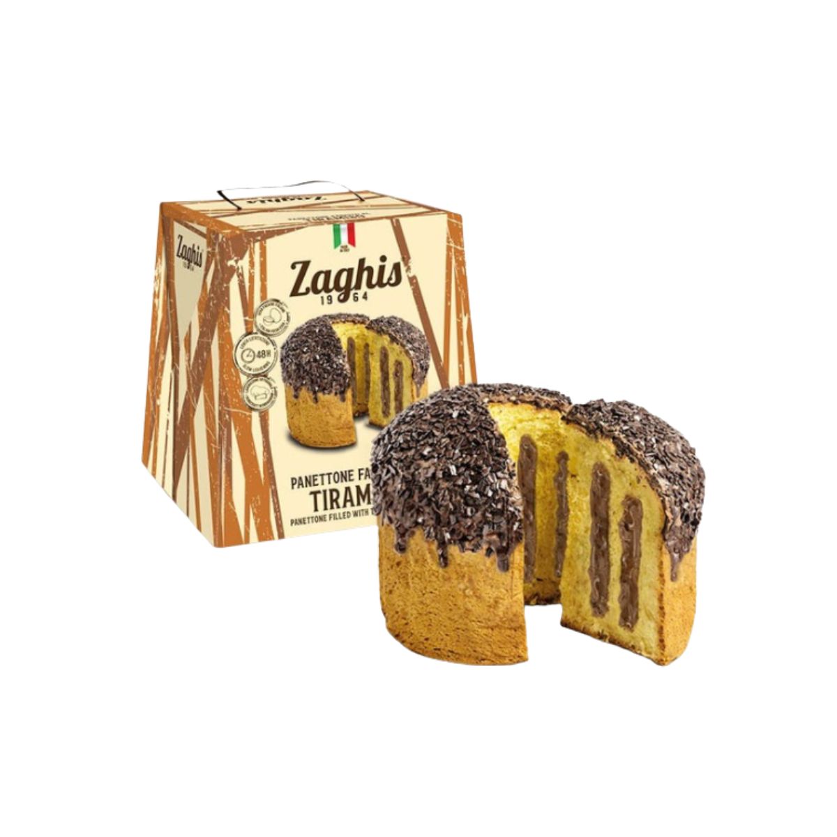 Panettone Farcito al Tiramisù Zaghis: grazie alla farcitura al Tiramisù dal delicato gusto di caffè, si uniscono in un soffice Panettone i sapori unici dei due dolci veneti più famosi e apprezzati.
