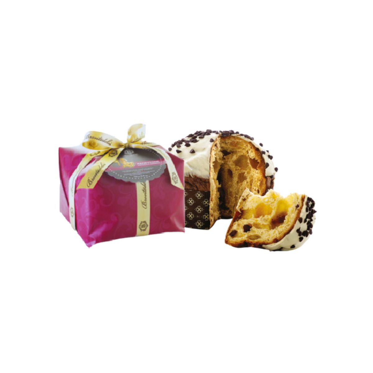 Panettone Fragola e Amarene Brontedolci : panettone ottenuto dalla lievitazione naturale e da ingredienti accuratamente selezionati. Un impasto leggero, morbido. Farcito con fragole e amarene e con copertura di cioccolato bianco e gocce di cioccolato fondente.