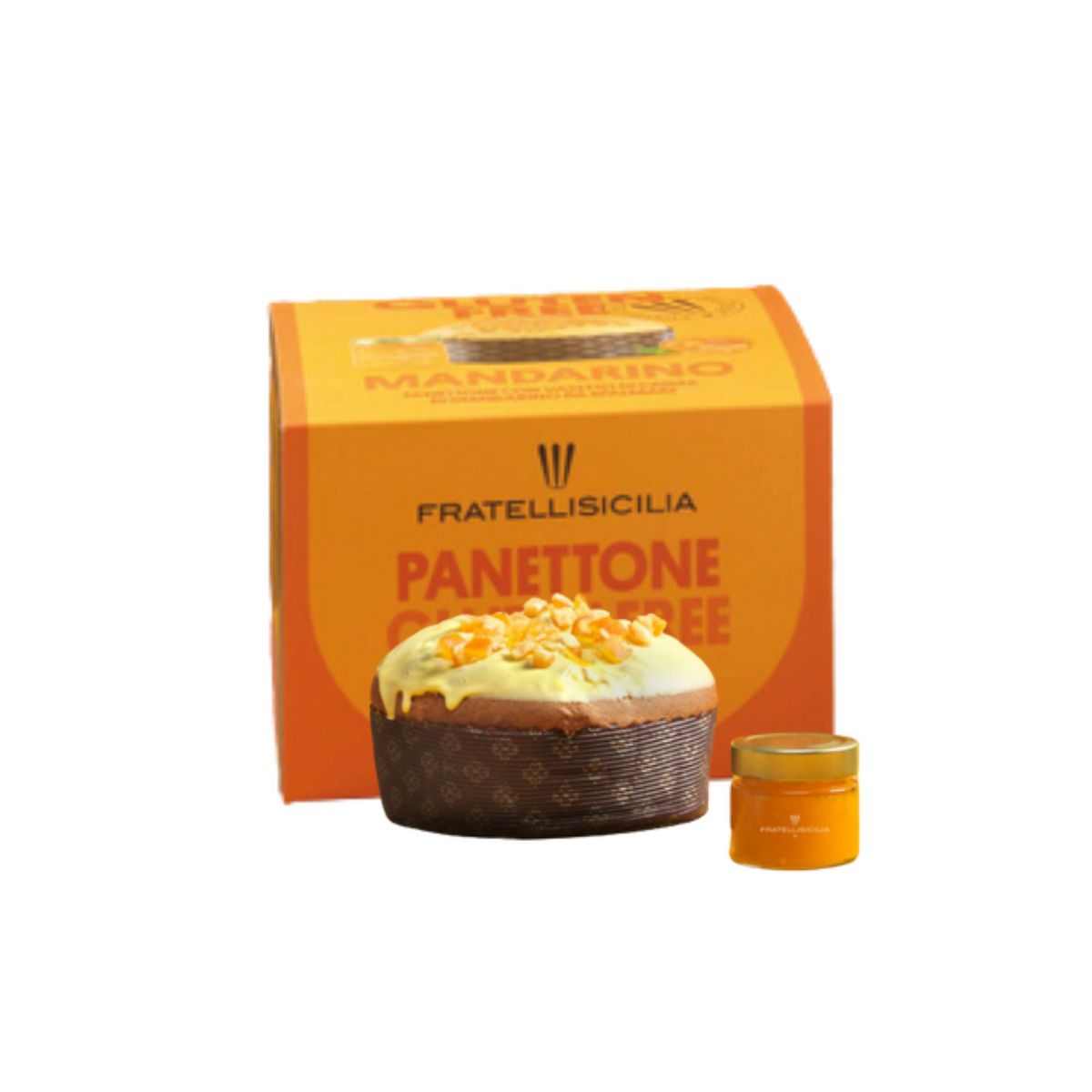 Panettone Gluten Free al Mandarino con Crema spalmabile al Mandarino Fratelli Sicilia : trentasei ore di lievitazione insieme ad una sapiente lavorazione che hanno permesso di creare un prodotto soffice, profumato e dal sapore intenso. Prodotto artigianale ricco di burro e realizzato con farine di mais e riso. Totalmente privo di glutine. Soffice impasto, glassato con cioccolato bianco al mandarino, con vaso di delicata crema di mandarino da spalmare sul panettone.