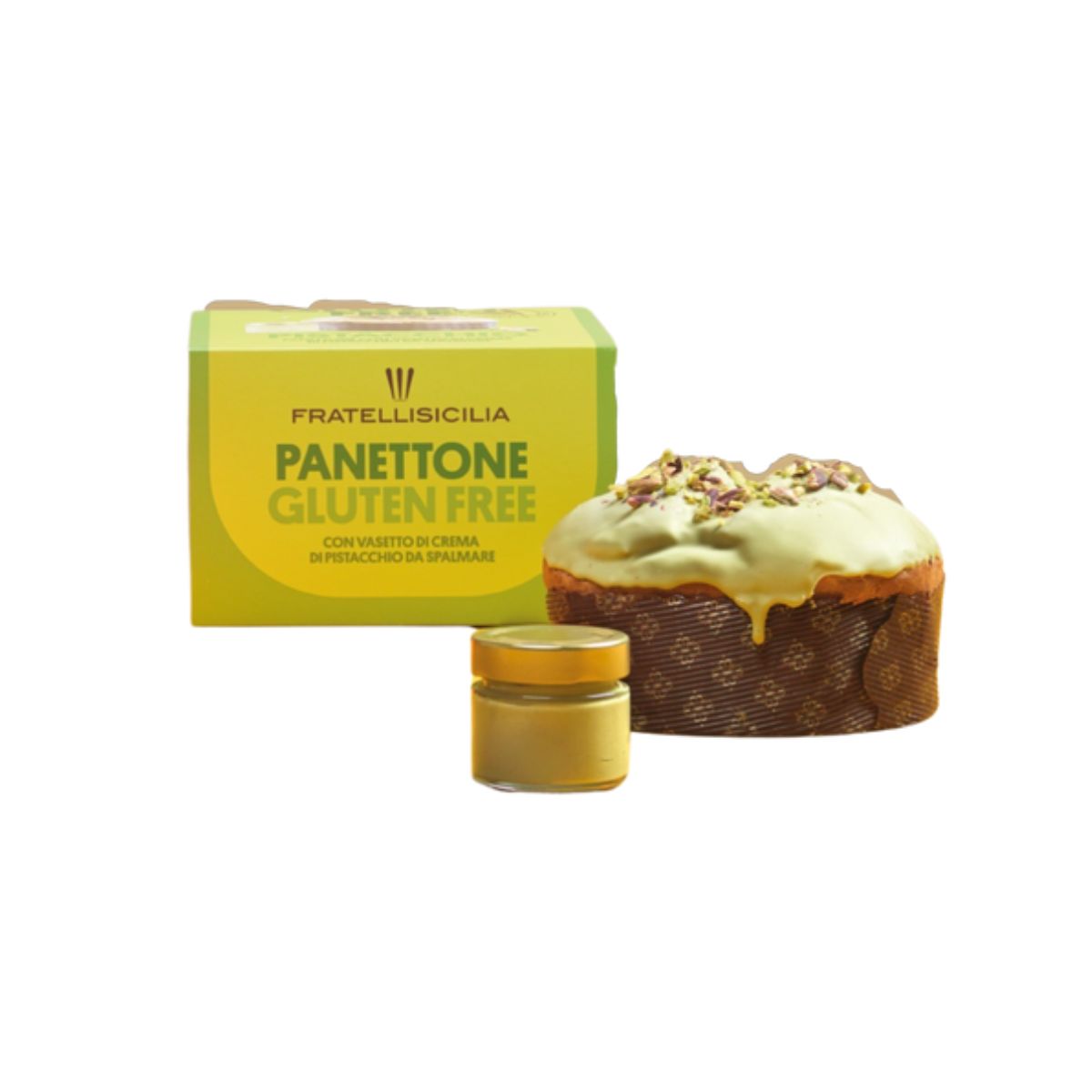 Panettone Gluten Free al Pistacchio con Crema spalmabile al Pistacchio Fratelli Sicilia: trentasei ore di lievitazione insieme ad una sapiente lavorazione che hanno permesso di creare un prodotto soffice, profumato e dal sapore intenso. Prodotto artigianale ricco di burro e realizzato con farine di mais e riso. Totalmente privo di glutine. Soffice impasto, glassato con cioccolato bianco al pistacchio, con vaso di golosa crema di pistacchi da spalmare sul panettone.