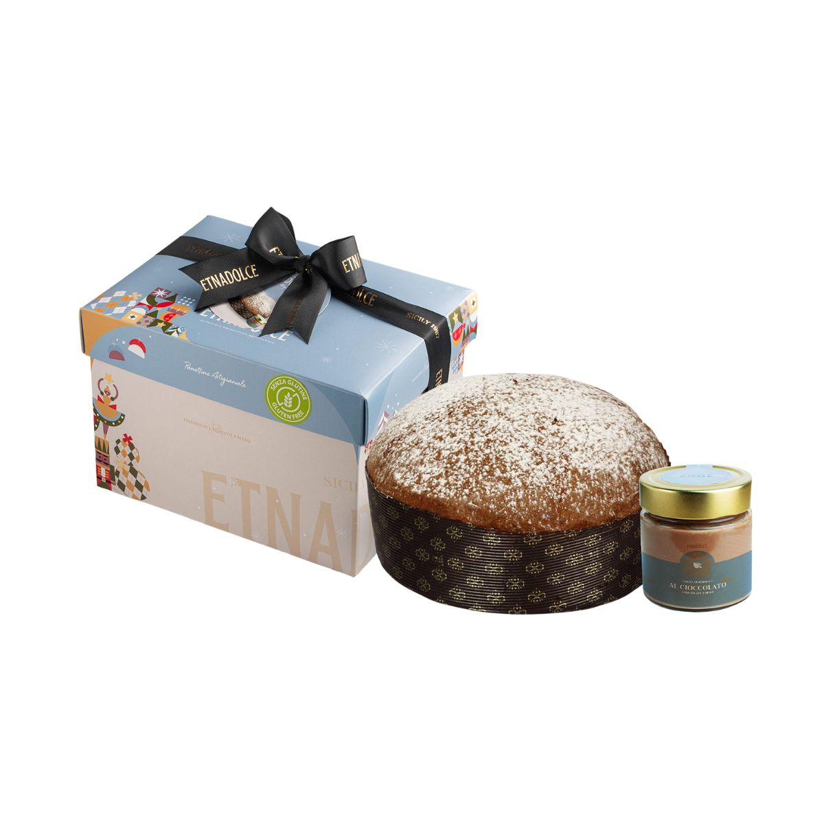 Panettone Panpandoro Senza Glutine + Crema al Cioccolato di Modica I.G.P. Etna Dolci: un impasto prodotto con ingredienti selezionati e una lenta lievitazione danno vita a questo meraviglioso dolce gluten free che vi conquisterà. Accompagnato da un vasetto di crema spalmabile al Cioccolato di Modica IGP da 240gr.