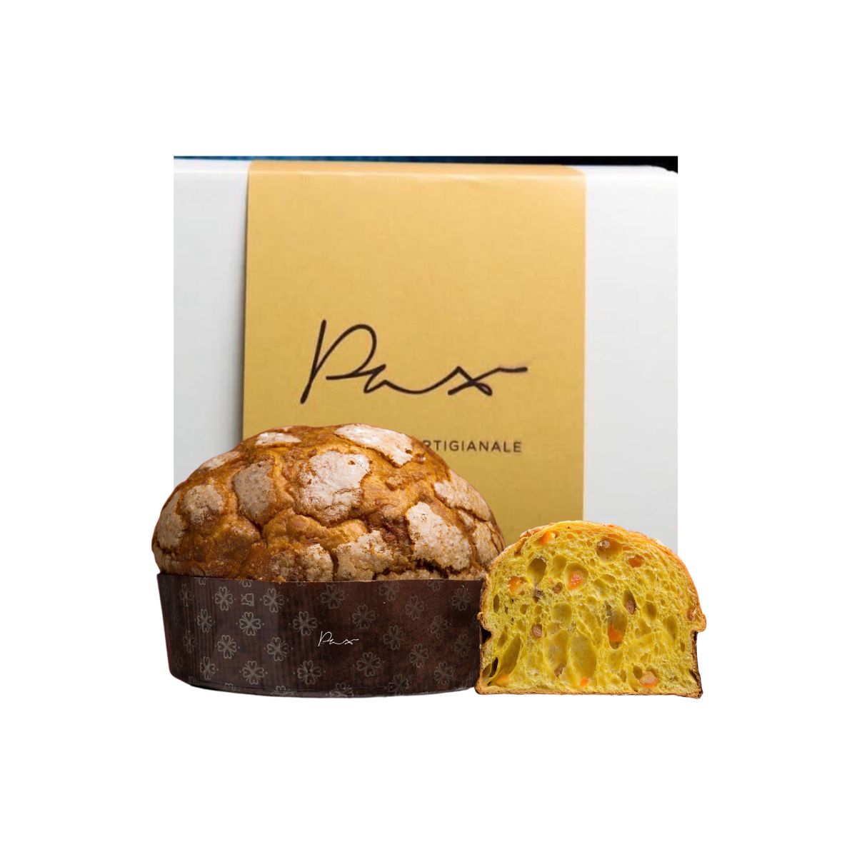 Panettone Tradizionale Pax: è arricchito da scorzette di arancia di Calabria candita a bassa temperatura, per evitare la perdita di olii essenziali preziosi e mantenere la morbidezza della polpa dell’arancia, uva sultanina australiana 6 corone, miele d’acacia di Toscana e vaniglia bourbon. Glassato con amaretto dolce alle mandorle Pugliesi.