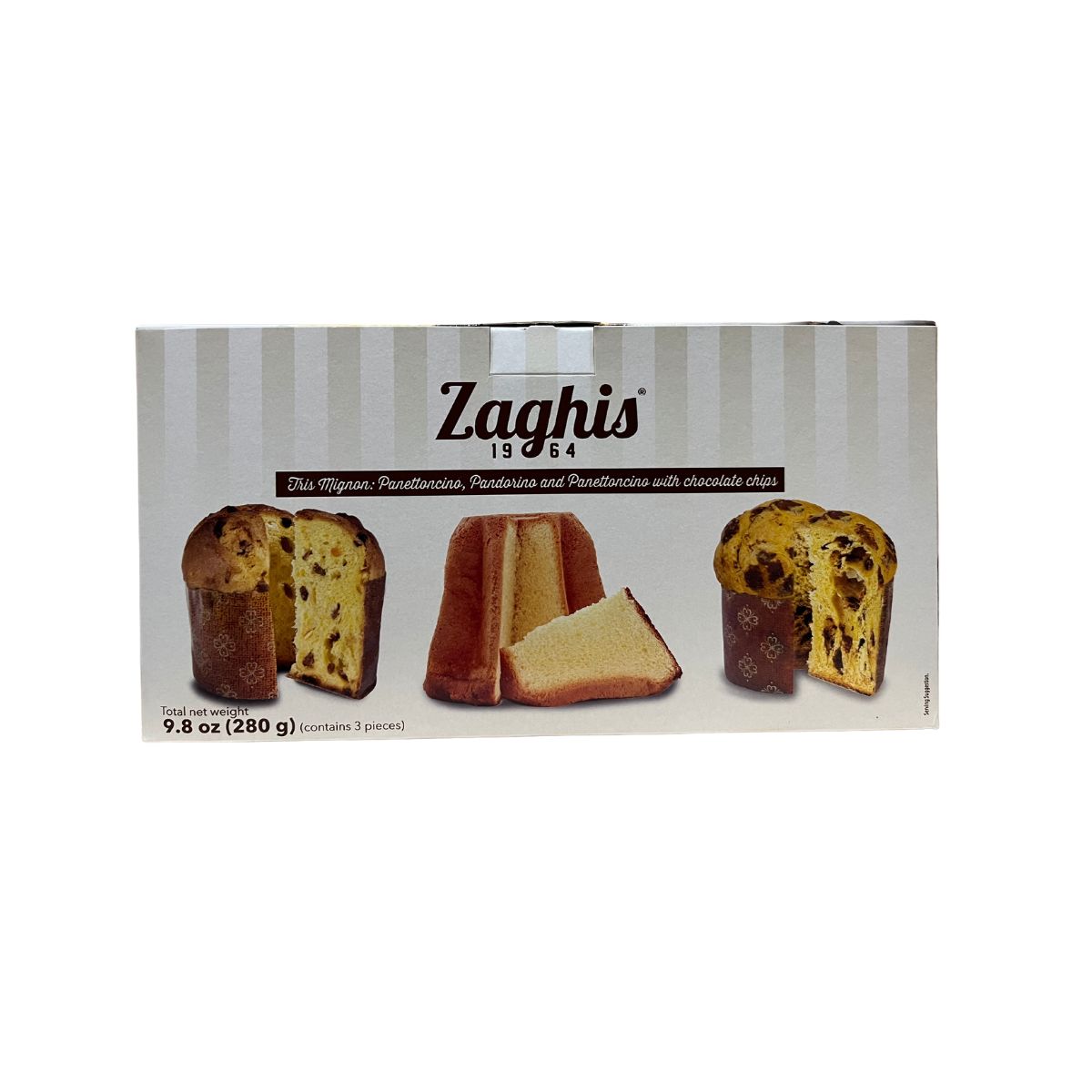 Tris Panettoncino da 280gr Zaghis: da ingredienti di prima qualità e lievitazione naturale nascono i panettoni Zaghis. Il tris è composto da: panettone classico – panettone al cioccolato – pandorino