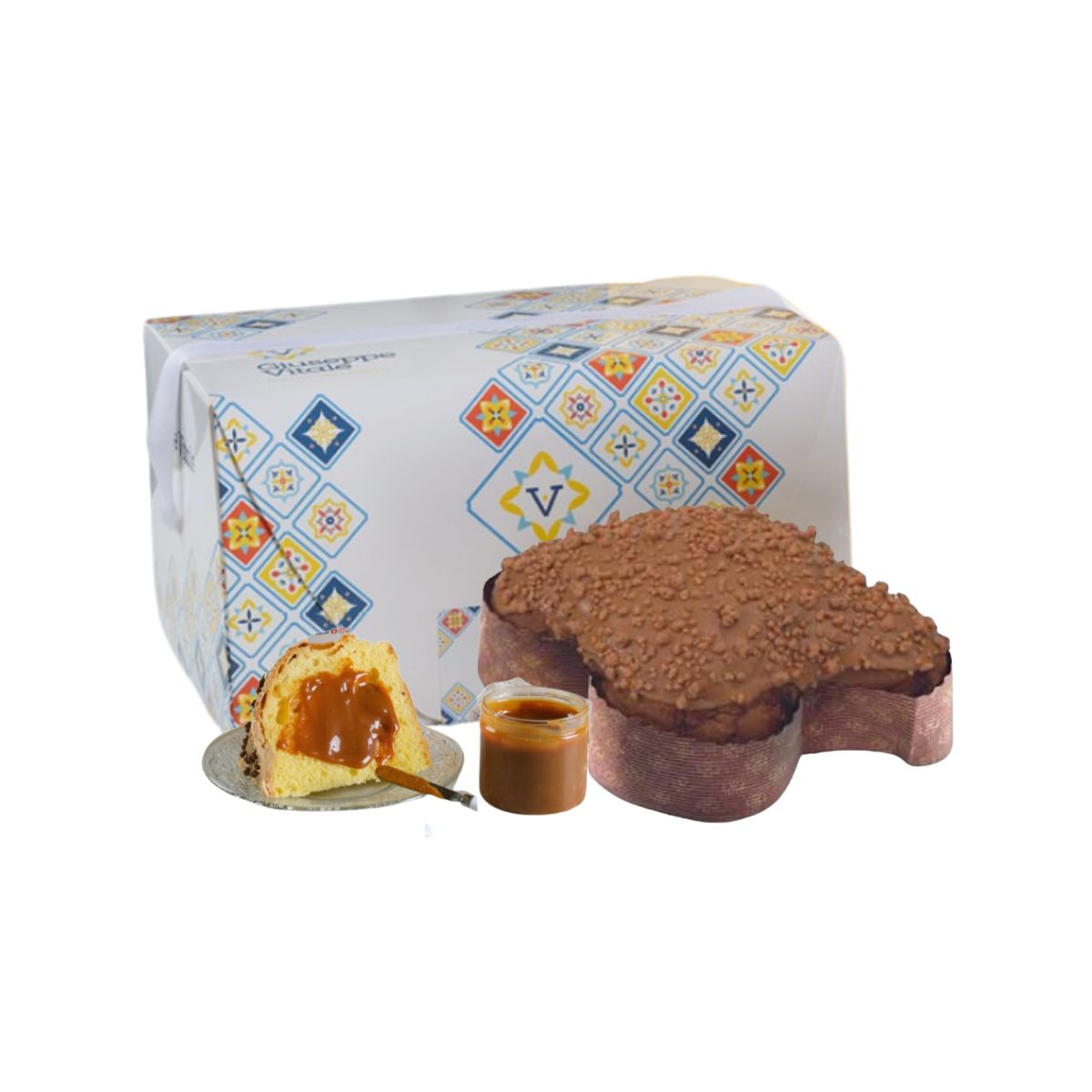 Colomba al Caramello Salato + vasetto da 200g di crema al Caramello Salato Vitale: dolce artigianale con copertura al cioccolato. Accompagnata da un vasetto di crema al Caramello Salato da 200g e lo spalmino.