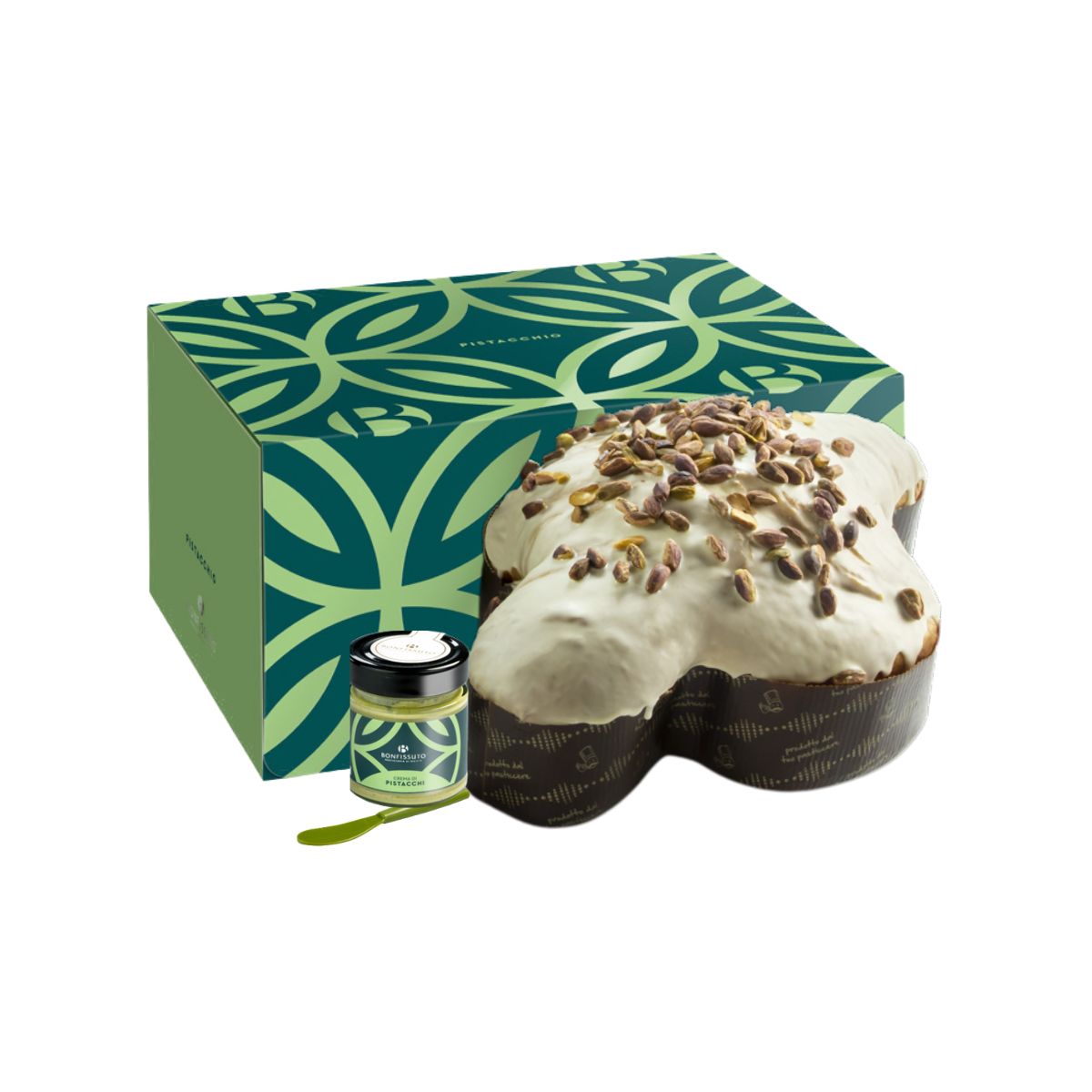 Colomba al Pistacchio Bonfissuto :è una colomba pasquale da forno tradizionale a lievitazione naturale con copertura di cioccolato bianco e pistacchi interi. Inclusa crema di pistacchi di Sicilia da spalmare. INGREDIENTI: farina di grano tenero tipo 0, burro, burro liquido, tuorlo d’uovo di galline allevate a terra, zucchero, miele, fruttosio, lievito madre naturale (frumento), monotrigliceridi degli acidi grassi, sale, enzimi naturali, bacche di vaniglia del Madagascar, arami naturali.