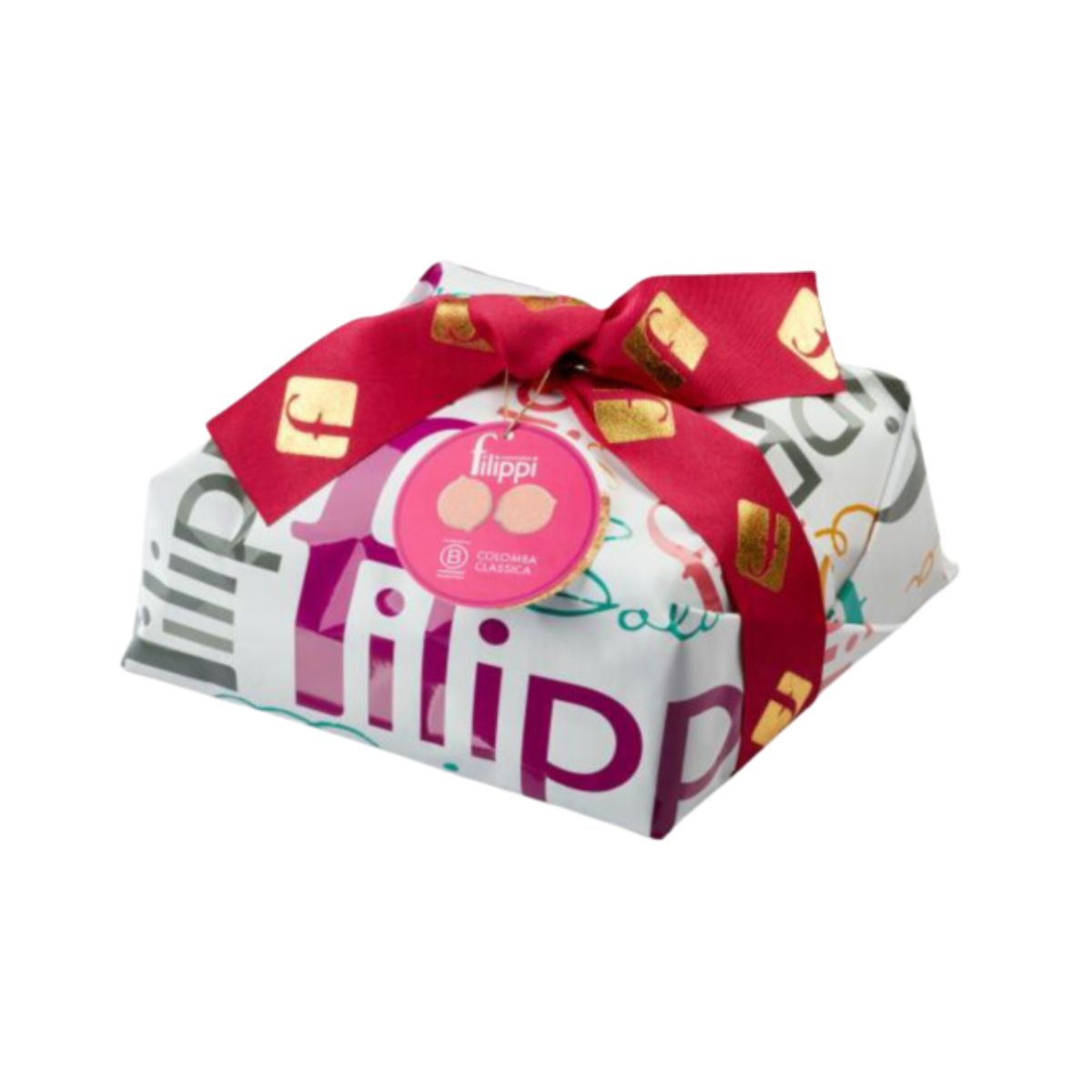 Colomba Classica Filippi 1 Kg: colomba ottenuta dalla lievitazione naturale e da ingredienti accuratamente selezionati. E’ fatta con burro, farina, uova e bacche di vaniglia sono sapientemente miscelati a formare una trama glutinica irregolare tipica della lievitazione naturale. Cubetti di scorzone d’arancia candita arricchiscono e profumano un impasto soffice e dal gusto delicato. La glassatura è ricca e croccante, ottenuta miscelando pregiate mandorle “Prima Bari”, zucchero ed albume