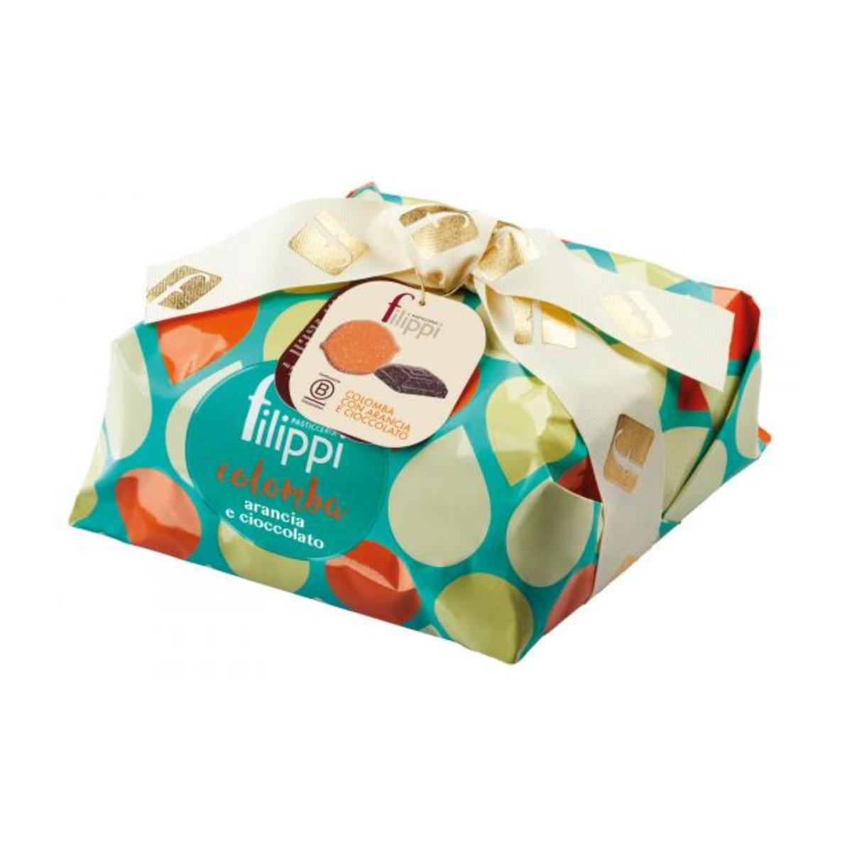 Colomba con Arancia e Cioccolato al Latte Filippi 1 Kg: è lievitate naturalmente, non contiene conservanti o additivi chimici ed è confezionate a mano con l’utilizzo di materiali sostenibili o riciclati. Mescola morbidi cubetti di arance di Calabria, candite naturalmente, con tante gocce di cioccolato. Il suo profumo è sensuale da bacche di vaniglia, fruttato e fresco di scorze di arancia e le note di nocciola dell’ottimo cioccolato che la guarnisce.