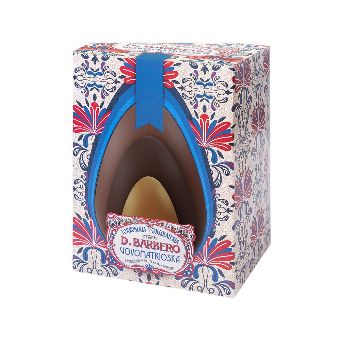 Uovo Matrioska Davide Barbero: composto da un uovo esterno di cioccolato fondente, un uovo intermedio di cioccolato al latte ed un uovo interno di cioccolato al caramello.
