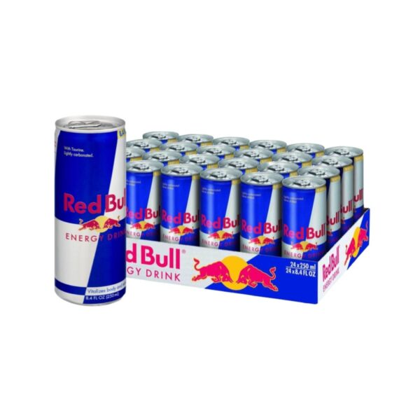 Red Bull: è una bevanda energetica analcolica di colore ambrato brillante, con taurina e caffeina, è gassata ed ha un gusto leggermente dolce fruttato tendente all’acerola. Confezione da 24 lattine