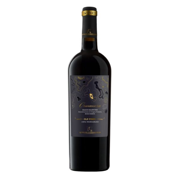Ormanera Salice Salentino Le Vigne di Sammarco: è vino rosso prodotto da uve 100% Negroamaro e affinamento prima 8-10 mesi in barriques di rovere francese di secondo e terzo passaggio, poi in bottiglia per 6 mesi. Alla vista si presenta di colore rosso rubino intenso con riflessi granati. Naso intenso e complesso, sentori di frutti rossi maturi con note speziate di cannella e tabacco, odori tipici della macchia mediterranea, tra cui salvia e rosmarino. Rotondo e robusto al palato, tannino morbido e persistente. ABBINAMENTI: piatti tipici come la zuppa di lumache monacelle, secondi di carne, carni bianche. TEMPERATURA DI SERVIZIO: 16-18°C.